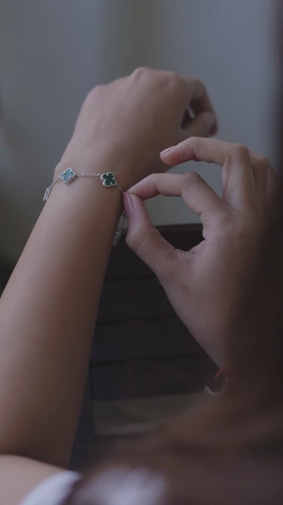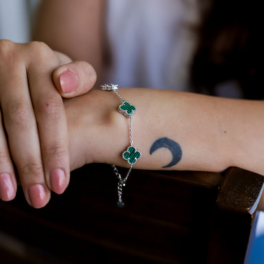 Green Inlay Clover Silver Linking Bracelet 6.5"+1.5" inch