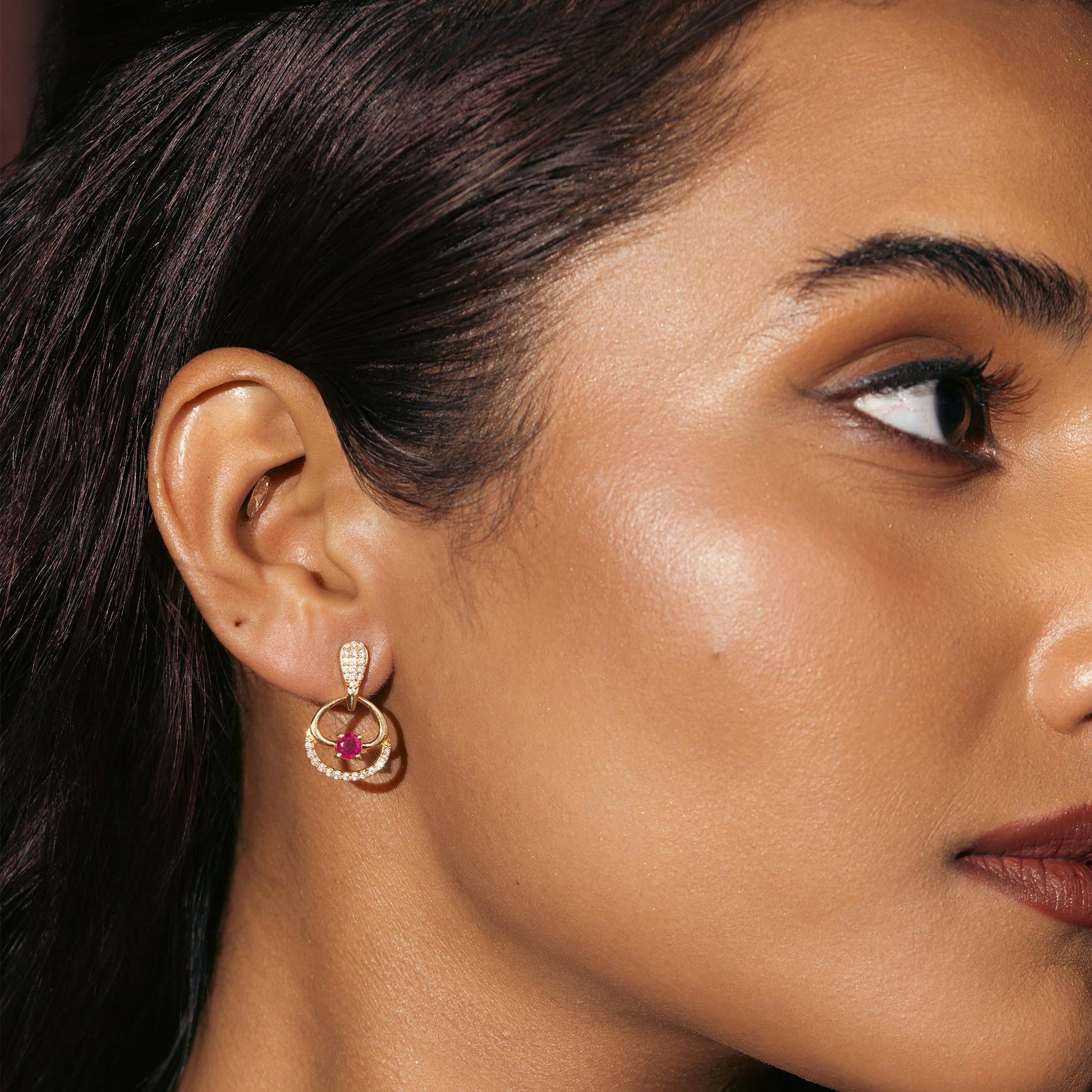 Shine bright at every occasion with these stunning 925 Sterling Silver Ruby and Zircon Circle Drop Earrings. These earrings have a modern circle drop design with a rich red ruby in the centre and sparkling zircon stones for extra shine.