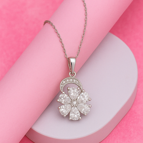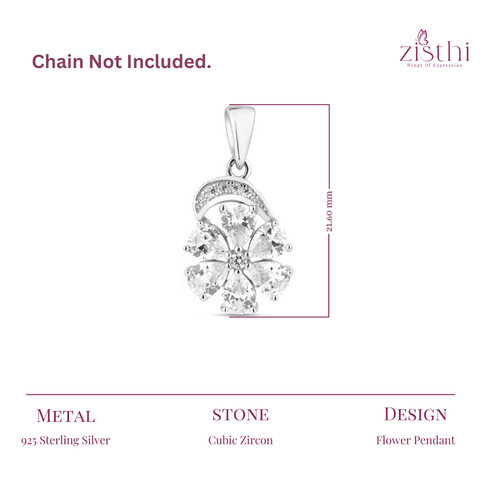 This beautiful pendant is made from 925 Sterling Silver and shaped like a sparkling flower. Each petal has high-quality cubic zircon stones, giving it a shiny and elegant look. The curved silver design above the flower adds a unique touch, making it perfect for any occasion.