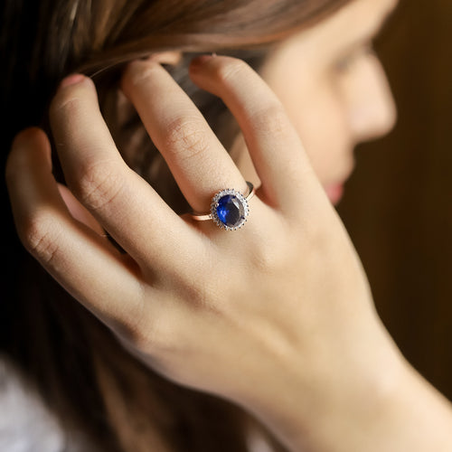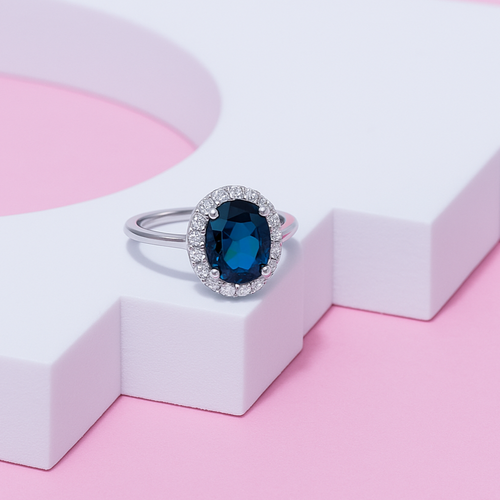 This beautiful ring comes with a deep simulated blue sapphire look stone in the centre, surrounded by small shining stones that make it extra special. Made from 925 sterling silver, it is strong, stylish, and perfect for daily wear or special occasions.