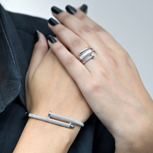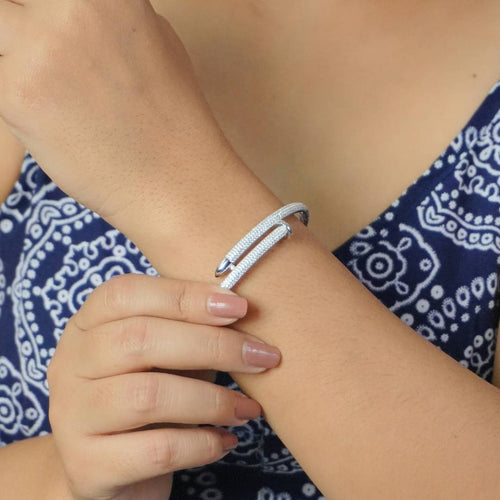 Bypass Love Bangle brings a modern twist to elegance. Designed with a sleek shape and adorned with sparkling zircon stones, it adds a sophisticated edge to any outfit. Perfect for both daily wear and special occasions, this bangle is crafted from high-quality sterling silver to ensure durability and style.