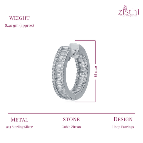 These elegant 15 MM hoop earrings are made from 925 Sterling Silver and feature beautiful zircon baguette stones, giving them a sophisticated and diamond-like shine. Perfect for everyday wear or special occasions, these earrings add a touch of luxury to any outfit.