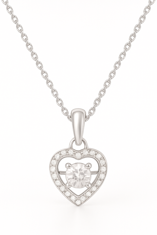 Show your love in a special way with this beautiful 925 Sterling Silver Dancing Diamond Heart Pendant Necklace. The heart-shaped pendant holds a sparkling dancing diamond that moves with every step you take — catching light and attention all day long!