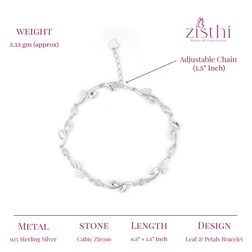 This Silver Leaf Bracelet brings nature's beauty right to your wrist. Inspired by delicate leaves, this bracelet is crafted from 925 sterling silver and is accented with tiny sparkling stones that add a subtle shine. Its adjustable length makes it comfortable for everyday wear or special occasions, perfect for those who love nature-inspired jewellery .
