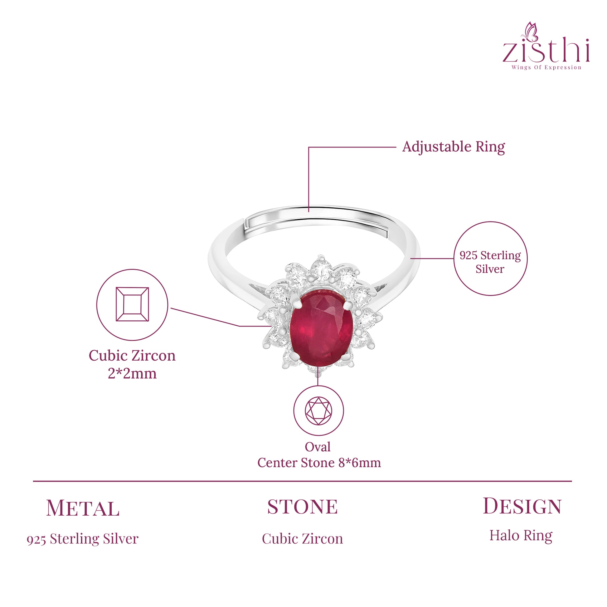 The ring has a bright red natural ruby in the centre, surrounded by a circle of sparkling stones that add extra shine and beauty. The halo design makes the ruby look bigger and gives it a grand, elegant look. The band is made with genuine 925 sterling silver that stays shiny and is safe for daily wear.